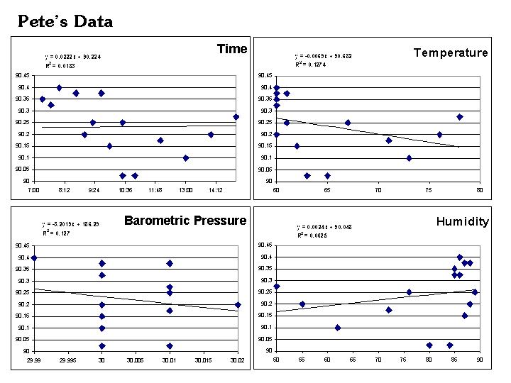 In Pete's data, there is no regression that explains more than 12.7% of the variation in Average Weight. That is to say, of the variation in the average from one reading to the next, there is really very little of it that can be explained by changes in the environment. That said, temperature and barometric pressure did better than Humidity and Time by a lot. Further, as Temp increased, powder charge decreased. As it did for Baro. Humidity was a pretty useless variable when used in this way, and while powder charge did increase with humidity, it only explained about 6% of the variance. And the slope was VERY shallow. Over a very wide range of humidities from 50-90%, the regression predicts only 0.1 gr of increase in the powder charge. That is to say, over the widest range of humidities that you are likely to encounter, Pete's powder charge might fluctuate one tenth of one percent due to humidity. That's damn little, and quite a bit less than the range of variation in the four samples that Pete took at each time interval. In other words, there is high probability that these trends that I've mentioned are really produced by simple measurement variation, and not by environmental conditions.
