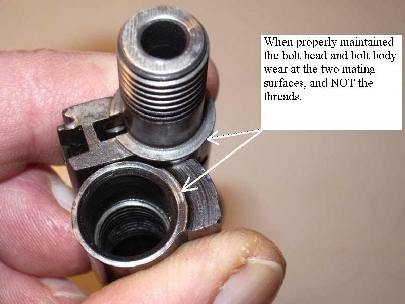 This brings me to another point... It's very basically this. If you cannot get headspace, even using the very relaxed criteria I have discussed here by using a new bolt and a #3 bolt head, then I'm afraid that it means your body is knackered. This quaint old Armourers technical term indicates that it's seen better days... it's xxxxed! You COULD allow yourself up to, say, .078" headspace but the technical opinion reached during research into this during the 50s is that it's a palliative and not a true cure.