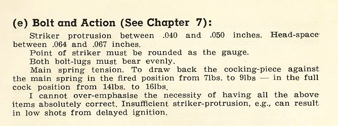 The next question you're going to ask is "where during the bolt closing movement is this slight feel of resistance acceptable --- Is it almost closed or, hardly closed or in between?" Good question and the answer in the bible reads thus: "with a 0, 1 or 2 bolt head, there must be resistance onto the .074" gauge prior to there being a minimum of .050" from the underside of the bolt lever to the contacting point of the body socket." Then it goes on to say "...With a #3 bolt head the left edge..." But I want you to forget this because the statement was too ambiguous. I suggest that you use my maxim of "WITH ANY SIZE OF BOLT HEAD FITTED THERE MUST BE RESISTANCE OF THE BOLT ONTO THE .074" GAUGE PRIOR TO THERE BEING A MINIMUM OF .050" FROM THE UNDERSIDE OF THE BOLT LEVER TO THE CONTACTING POINT OF THE BODY SOCKET. I want the master Masons among you to learn that by rote!