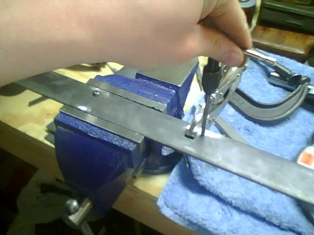 Do this with all of the remaining holes required in this length of the steel... Moving the vise grips as you go from one hole to the next... Before I screw in a hex-head button cap screw, I typically cut a Q-Tip in half, and soak one end with Hoppes #9 cleaning solvent. I then 'screw' the Q-tip into (and all the way thru) the newly threaded hole, and it catches & cleans out any burrs, or metal shavings before I put in a screw.