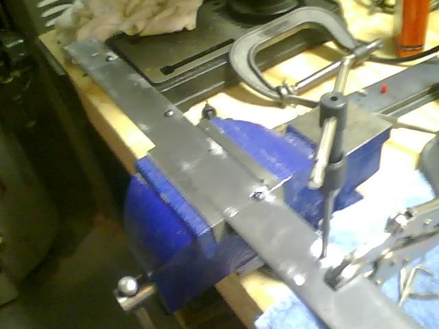 Once you've got 2 of the holes spaced far enough apart, and have them threaded, you can tighten the 2 pieces together nicely with just the screws - no need for clamps anymore (until you start threading more holes). Then center punch all the remaining holes along the line, and get back to drilling them all...