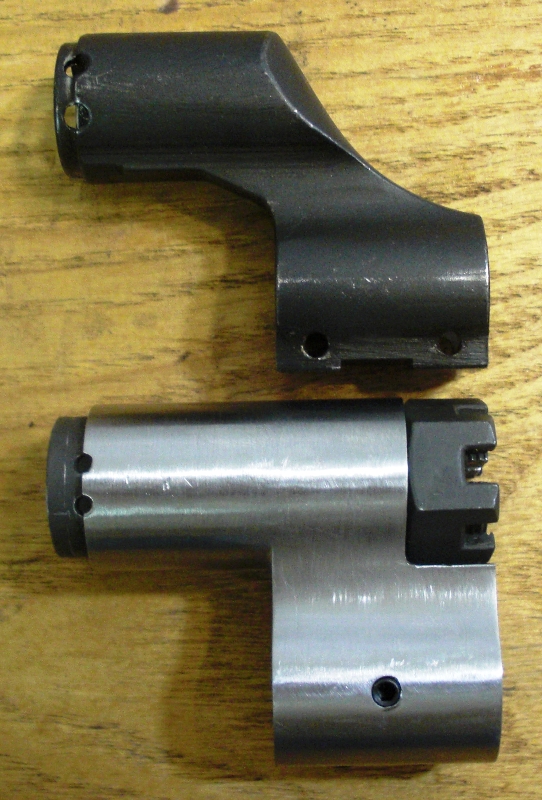 3) Vepr trunnion. Remember the two-rivet Yugalil above? Now I know what the extra rivet is - there's no bolt turning ramp on the bullet guide, so it has a "bolt kicker" rivet like a Saiga. Actually, I don't see a bullet guide at all in this shot. Some Chinese trunnions didn't use bullet guides, from what I've heard.