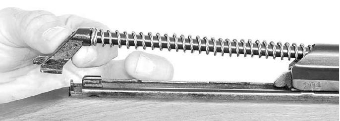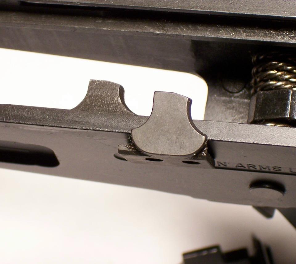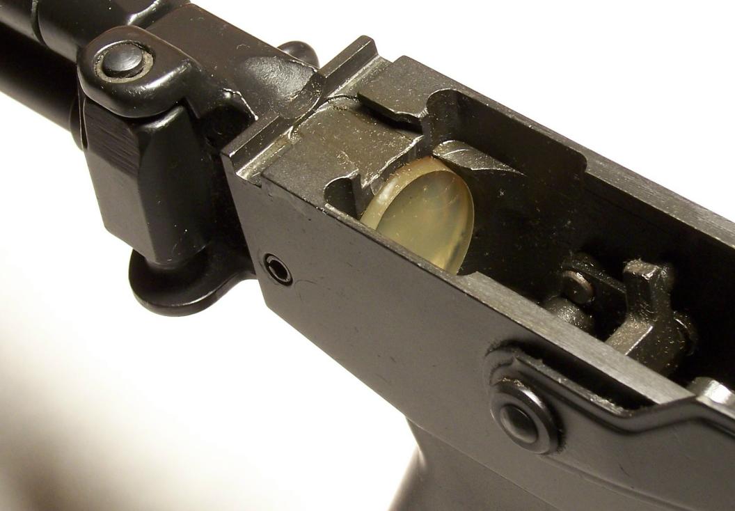 The bolt carrier isn't *supposed* to hit the rear of the receiver, but firing pressure goes up as temperature goes up. Whatever powder they were using for their ammunition probably got a little happy on really hot African days, so Vektor installed the buffer. It snaps into the round hole in the back of the receiver. The Israelis didn't use a buffer in the Galil, but they were probably using a different powder in their military ammo.