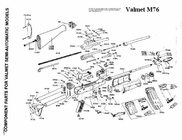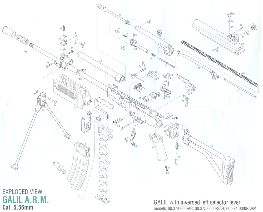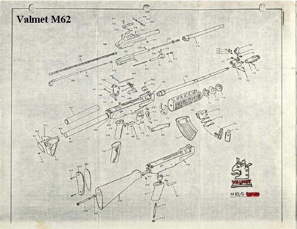 1) Galil exploded view. This one shows how the carry handle attaches to a collar behind the foregrip. The Valmet/Galil/R4 gas tube is a couple of inches longer than an AKM tube since the Valmet doesn't use a rear sight block. The distance between the ears on the front trunnion is the same as a Yugo, plus there are small square slots cut on the inside bottom of each ear. The rear of the gas tube has small square tabs that slide into the trunnion so it doesn't fall off. The top cover holds the gas tube in place instead of the slot and lock of an AKM. This means the top cover carries the recoil load of the weight of the gas tube, which is another reason the Valmet top covers are (usually) reinforced. The odd big round hole at the end of the receiver of the original Valmet design, which used a fat tube screwed into the back of the receiver instead of a wood or plastic stock. Steel held up better to cold Finnish winters than plastic. Also note the full-round front sight and spring loaded firing pin.