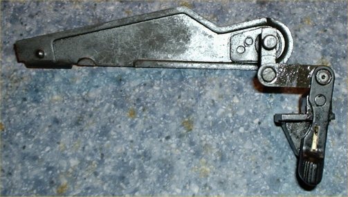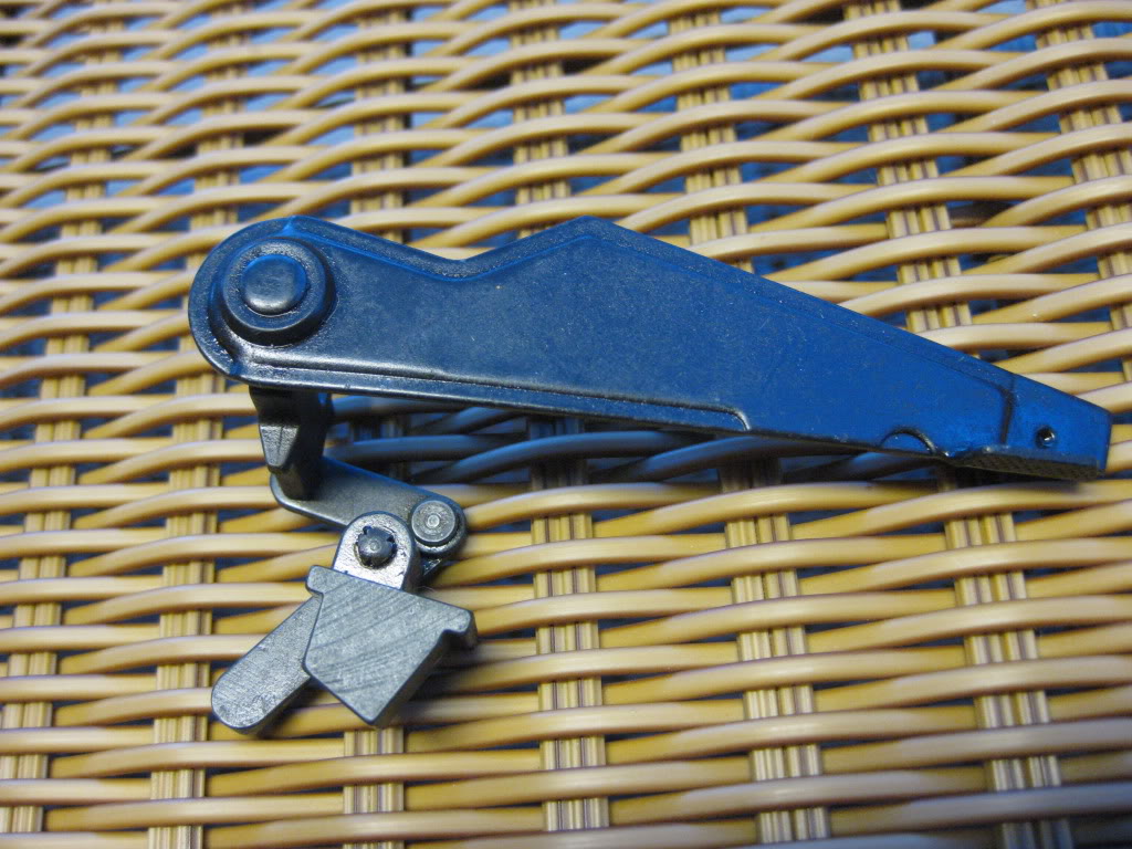 2) Most Galils have a Tantal-type lever on the left, which allows operating the safety with the right thumb. Since the rifle is safe with the selector up, the thumb lever is safe when forward. IMI got a contract to sell some guns to a buyer who insisted the thumb safety be forward to fire, which meant building a rocker and link assembly to reverse the motion of the thumb lever. The pivot is an extension of the grip nut. This picture is a bit misleading due to the weird angles; in the receiver, ithe grip nut would be down and back from where it's shown here, so the angles of the levers would work out right.