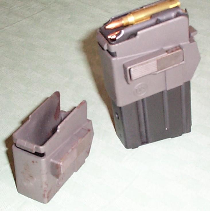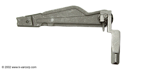 5) M-16 (NATO STANAG) adapter for Valmet/Galil/R4. If you've ever stuck an AR mag up into the bottom of an AK you've probably wonder HTF these things can work; there's only .050" or so clearance front to back; not enough room for the mag plus the adapter. See the slot in the front? That overlaps the front of the receiver (remember, slant cut) so the mag is right up against the receiver. The back wall is cut away, so the back of the mag is against the back of the receiver. This adapter is held in by the AK's usual latch; some adapter designs are riveted on at the latch pivot hole.
