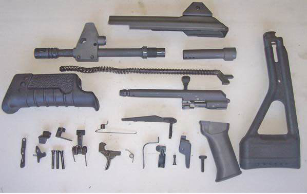 5) Micro Galil parts kit. Note unique gas block, threaded barrel, left side bolt handle