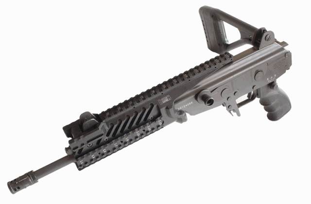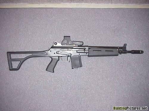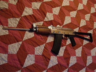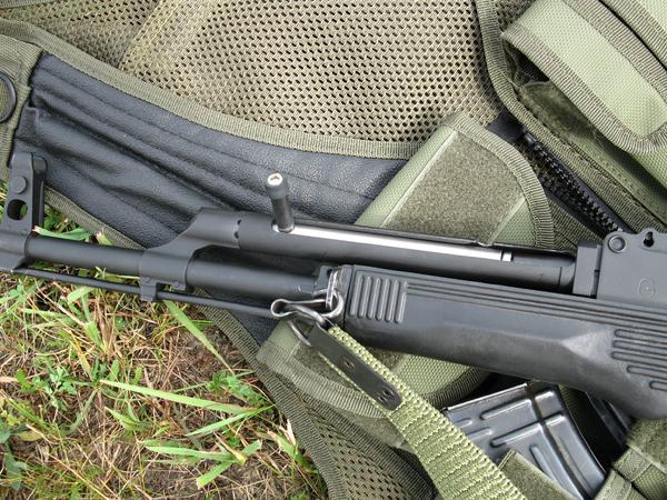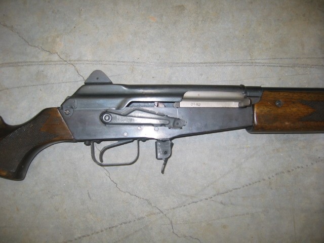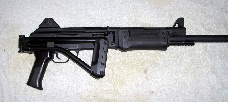 6) South African Vektor H5. Yes, it's a milled pump-action .223. Note the front sling swivel. I don't see a rear swivel... The top cover is normally held in place by the gas tube on Valmet-pattern AKs; without a gas tube, I'm guessing they've screwed or welded a bracket over the trunnion to take the front of the cover. Also note that, without the gas tube, they're using a new, lower cover, which means a completely different bolt. I see the usual Galil safety clearance in the pistol grip, but I don't see the safety lever or its pivot hole. There seems to be an extra hole and something hanging down in the trigger guard. I'm guessing there's no sheet metal selector on the right side at all. I've found a couple of pictures of the left side, none of the right.