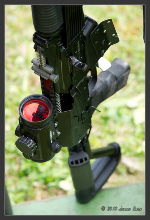 5) front charging handle conversion. What I *think* he's done is use a larger diameter gas tube, with the gas piston sliding inside the charging handle tube. The shiny ring at the rear is a stop collar clamped to the gas piston. The charging tube just sits there unless you pull the handle. I'm still fascinated by the front charging handle idea, but on the other hand, it's yet another opening for dirt and debris to enter the firearm. No free lunch, as the saying goes...