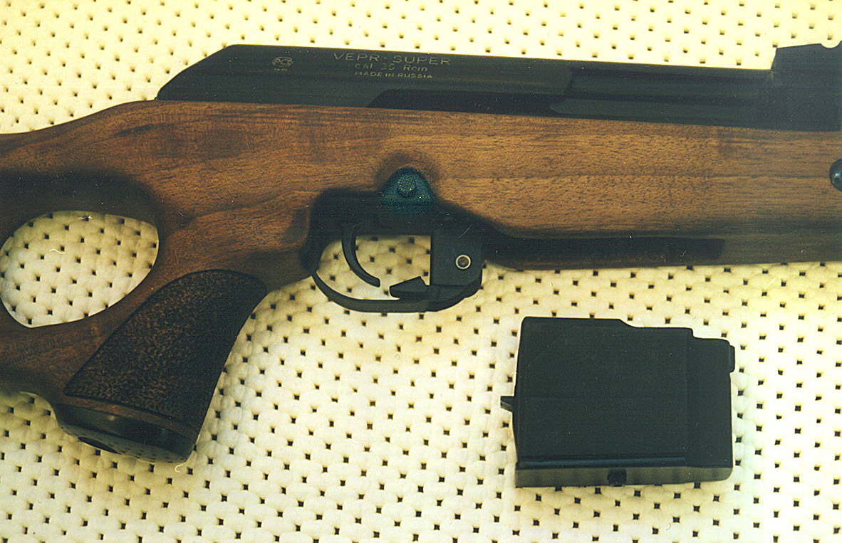 6) VEPR mag release and crossbolt safety. Also note the caliber - .35 Remington is a historical curiosity here, but if the pictures I keep finding of Russian and European market guns are any indication, it has made a big comeback over there. It's basically a rimless .357 Maximum and does its business at a rated 33,500 CUP, giving it a lot of bang for not much pressure.