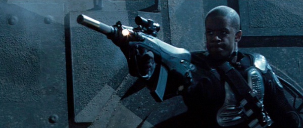 6) Vektor CR-21 bullpup. Yes, there's an AK inside the plastic shell. Frame from a really bad Scottish movie; the guy is a British actor, most famous for playing a con man in a TV series called "Hustle."