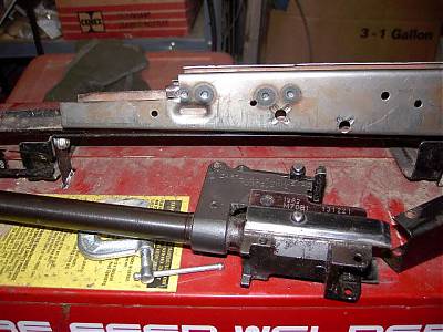 Below, we have a stamped receiver. Note how the front sheet metal goes up the side of the trunnion, and the foremost rivet is also the barrel pin.