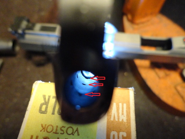 Your gun doesn't have any holes in front of the case mouth, so it must be using the dimples=delay idea. But XP001's pistol has twice as many holes, with the third row ahead of the case mouth. The third row of holes would have no function unless they were designed to feed gas back to the rear holes.