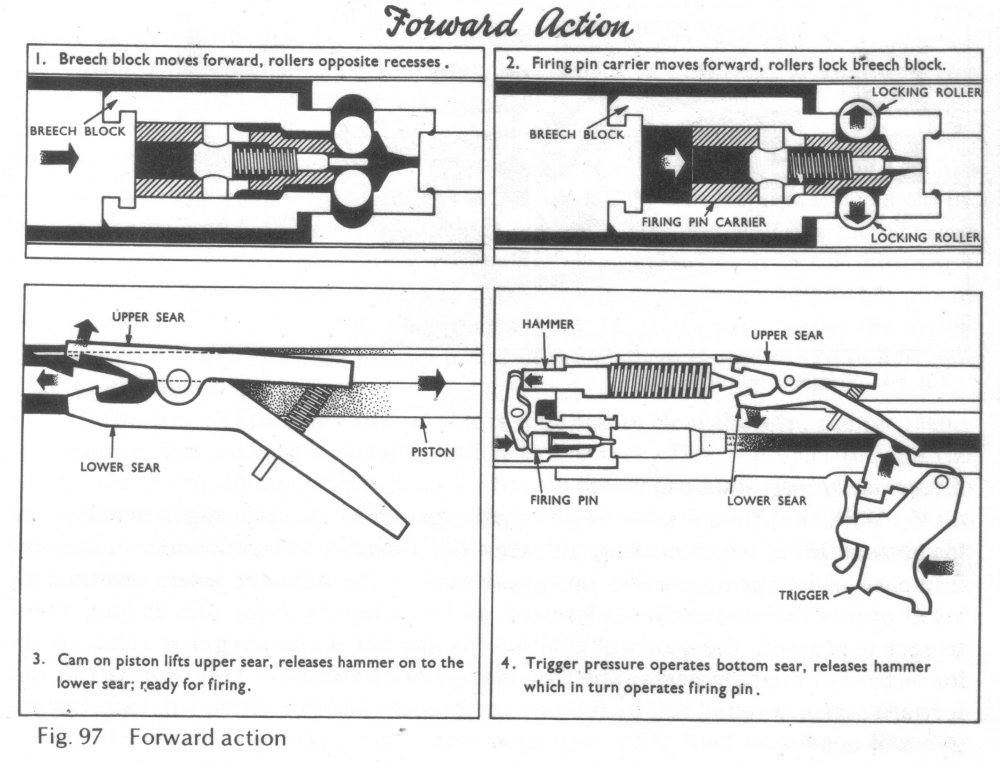 The firing pin sleeve moves back, the rollers cam in through the sleeve, everything unlocks. I'm not particularly thrilled at how the rollers can touch the firing pin. I imagine the unlocking would be somewhat brisk, even though theoretically the left and right rollers wouldn't put any bending force across the pin.