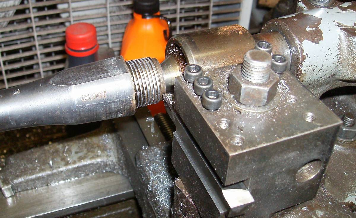 The reamer speed should be somewhere between 100 and 200 RPM depending on what references I use. The lowest speed on the drill press is 367 RPM; I've already run into that problem before, burning up >3/4" bits. Then I got a bright idea - the lathe will go down as low as 60 RPM in back gear. I'll find the speed closest to 100, put the reamer in a collet, and push the trunnion into it with the boring bar holder on the carriage. The boring bar holder has a 1/2" hole that will easily clear the 8mm reamer.