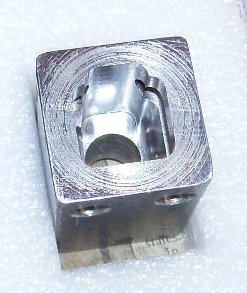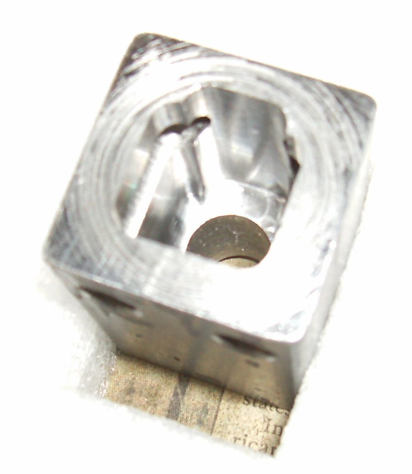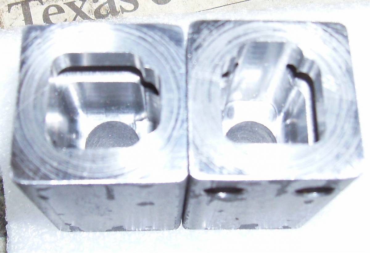 Two trunnions came back from the CNC guy. They're ordinary hot-rolled steel, also for function testing. Basically a radiused square hole, done with a ball- nose end mill. I was astonished at how nice the surface finish came out. The odd cutout goes to the bottom, to accomodate the "foot" on the bolt that slides between the magazine lips to strip a cartridge into the breech.