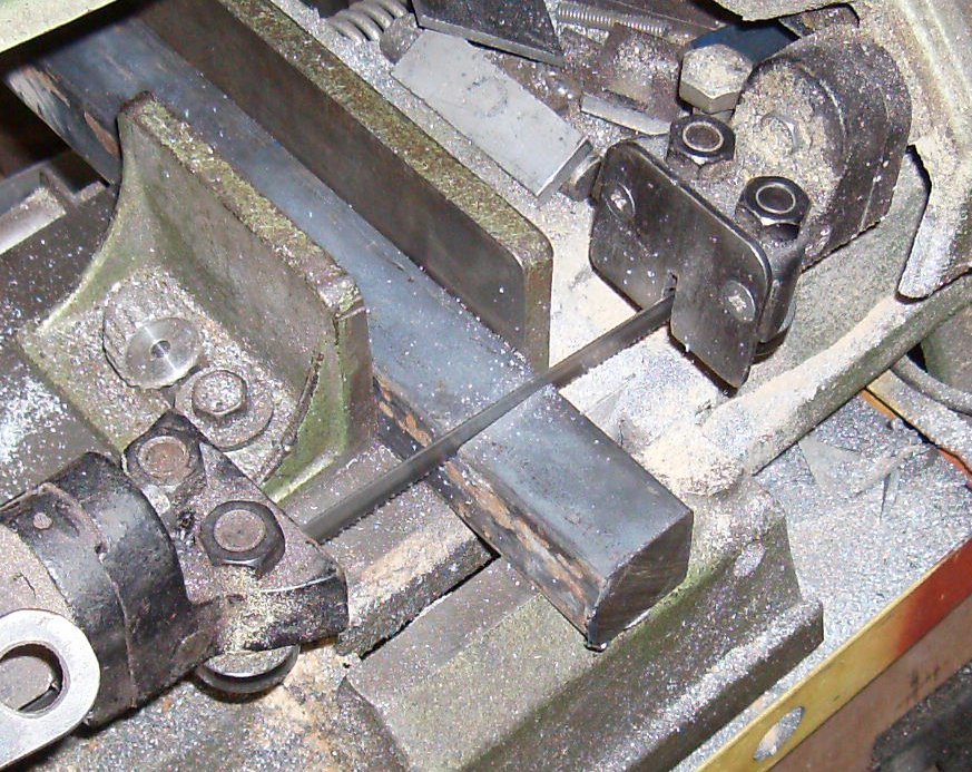 I sawed two pieces of hot-rolled square bar for the feed-and-fit test trunnions, and three pieces of 4140 for the real ones. I have enough 4140 for a couple more if I need them.